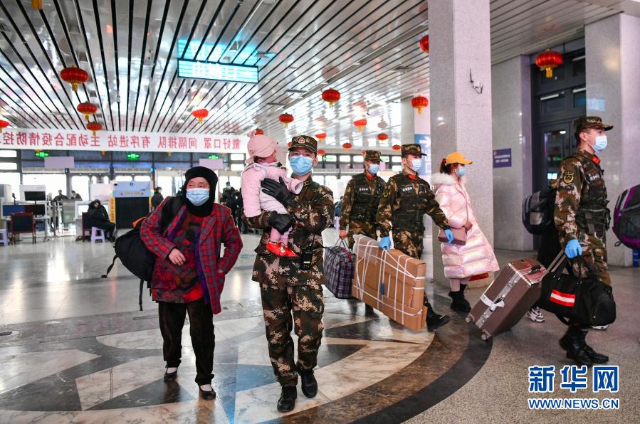 1月28日,機場接送價格武警甘肅總隊蘭州支隊執勤官兵在蘭州火車站幫助搭客進站。